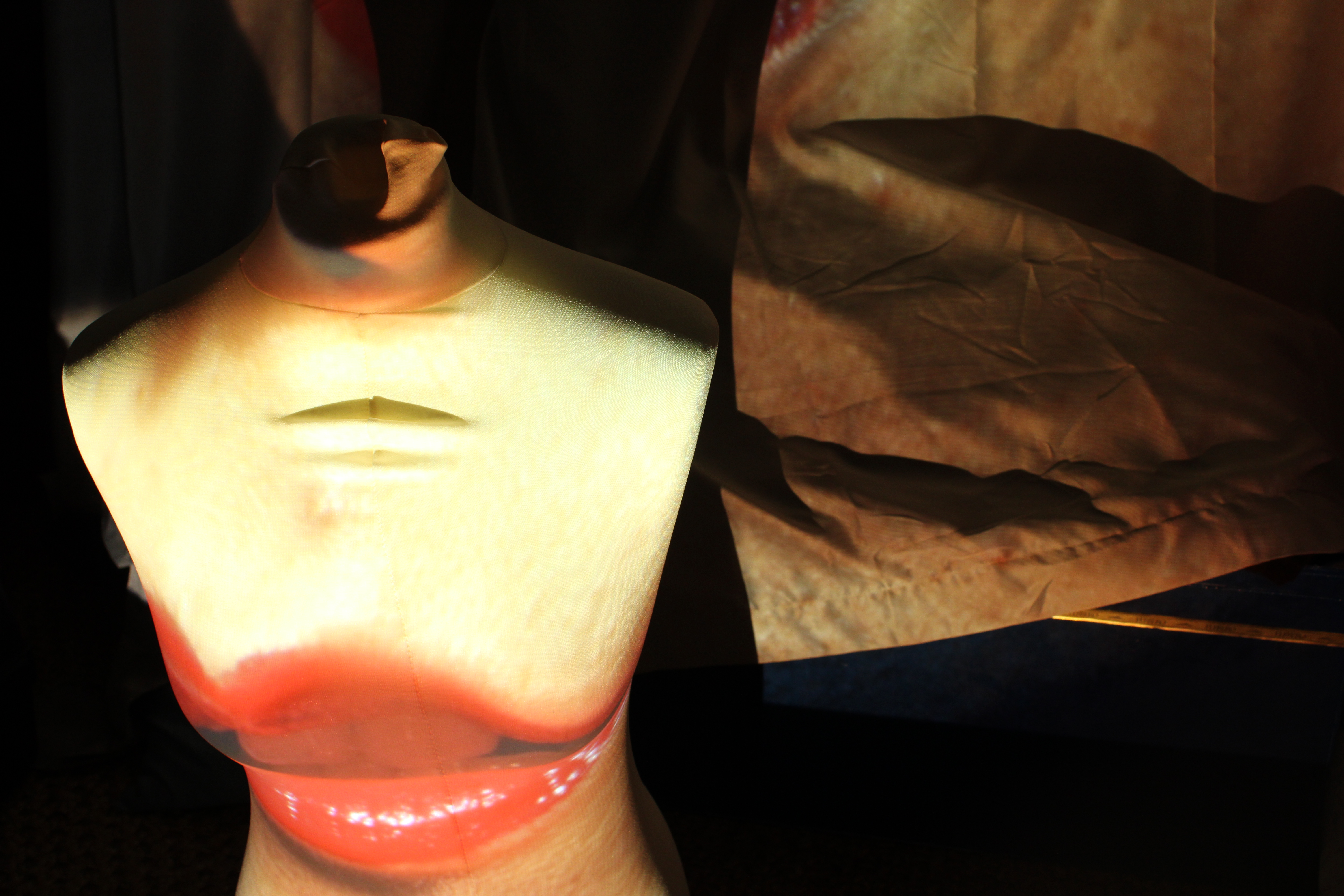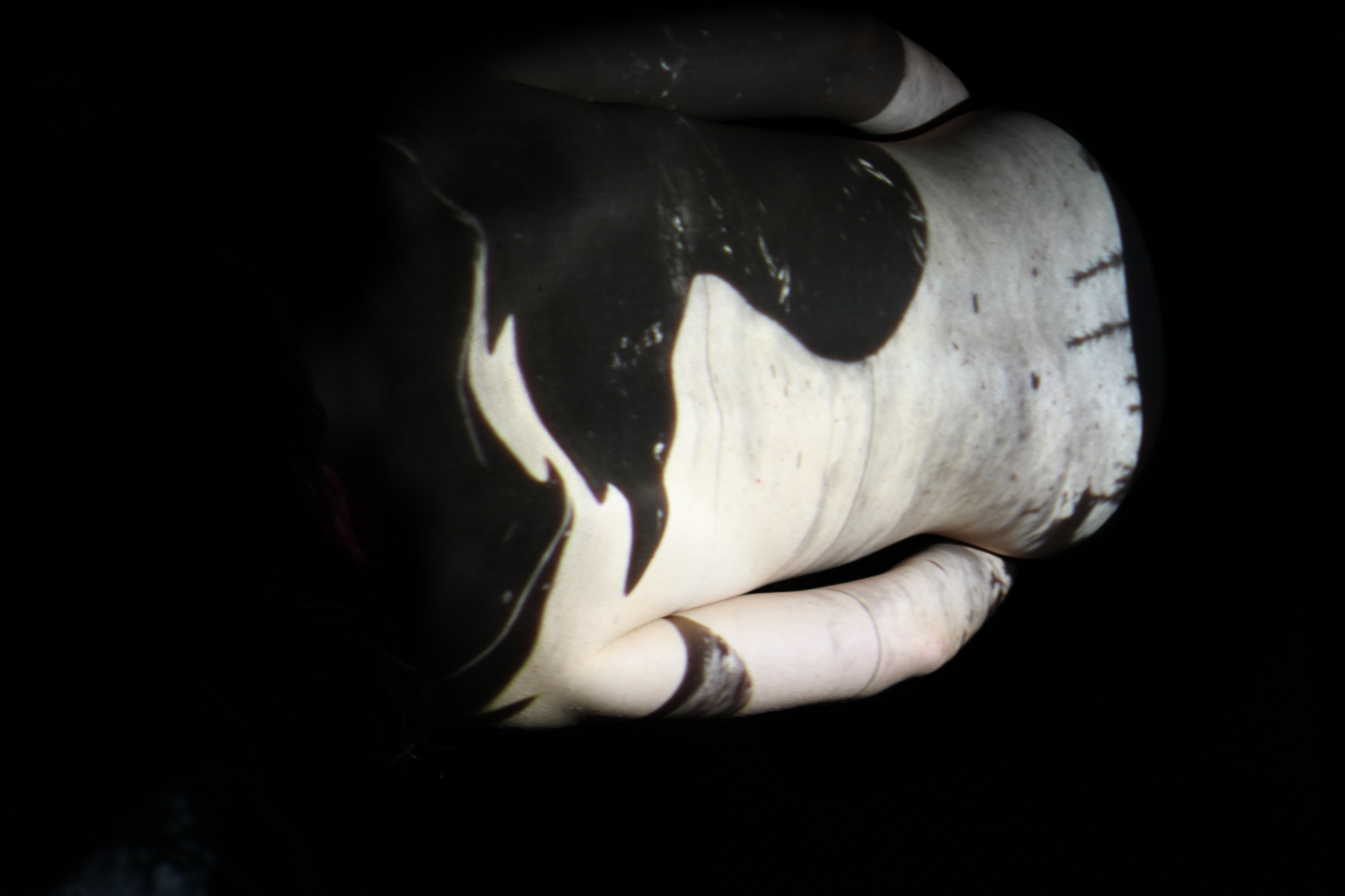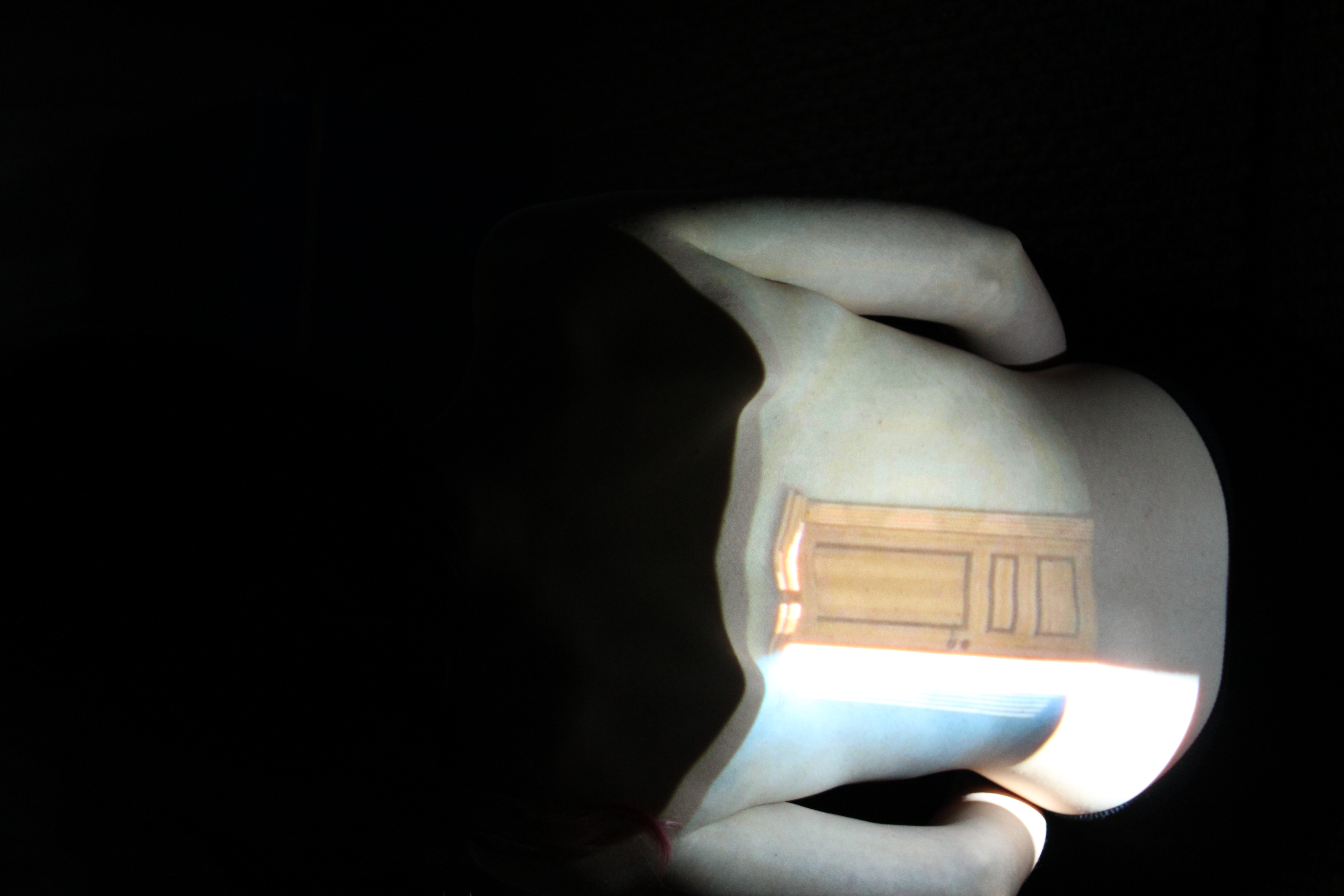 Video clips in which the performer’s female body are distorted, transformed and warped through projection uncover darker emotional experiences including feelings of shame, fear and isolation are contrasted with those exploring more positive feelings of self care and realisation, hinting at a route to recovery.